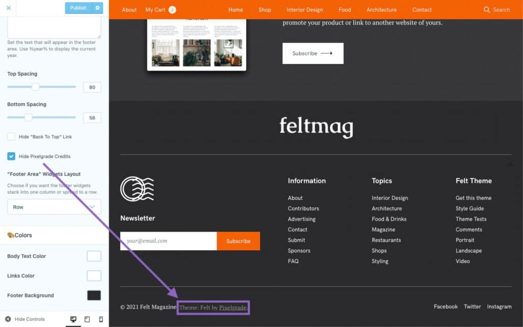 You can easily hide the mention from the footer by simply enabling this option from Appearance → Customize → Theme Options → Footer: