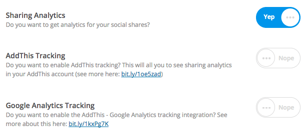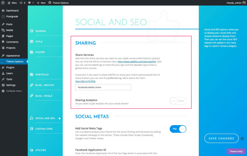 Finally, you can activate Social Sharing Analytics to capture insightful data about your social activity. All you have to do is to go to Theme Options → Social and SEO. You will find two secondary options allowing you the freedom of either using the custom AddThis Analytics (you will need to enter your AddThis username) or your Google Analytics account (you will need a Google Analytics Property ID).