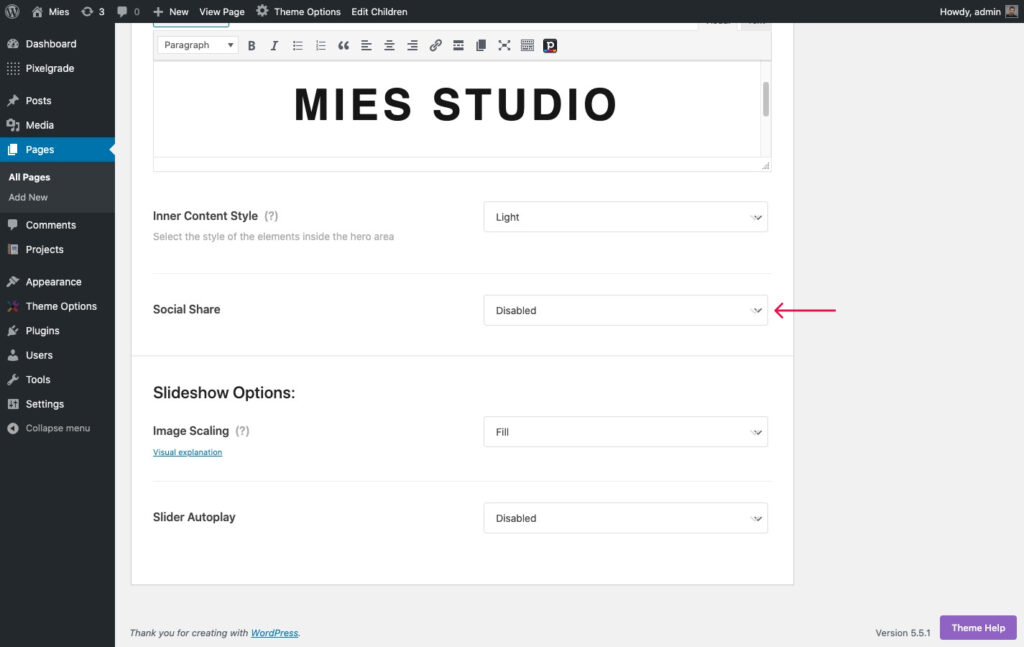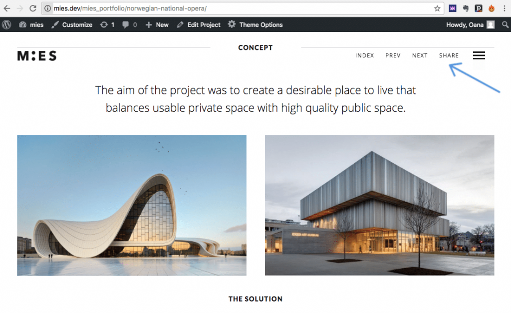 You can also customize the text (Share in this case) by going to Theme Options → Portfolio → Share Link and entering the name on the field. If you plan to get rid of all the share links (even though we don’t recommend it), you need to leave the above field empty, and we will not display the link or any AddThis scripts.