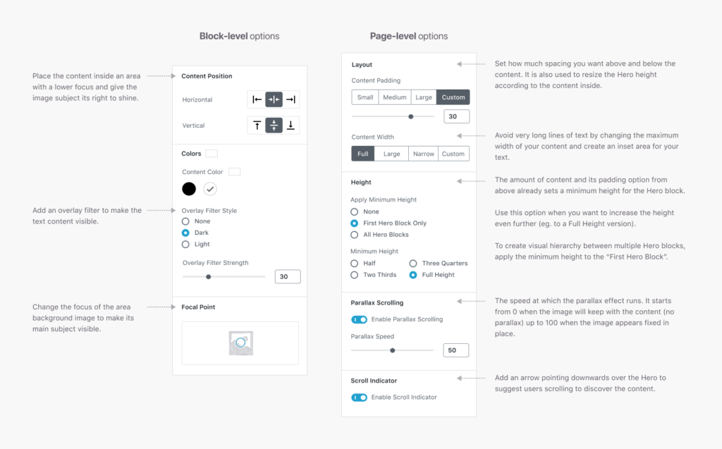 Both in the Toolbar above the selected block and in the Inspector sidebar, you can customize the design and behavior of the Hero blocks. To retain the overall logic and consistency of the Hero blocks design within a page, there are two different sets of options: