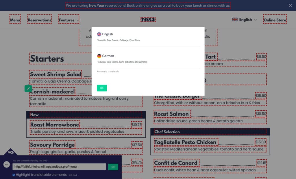 For the restaurant website example, you might be fine with automatic translation for some parts of your site, but you probably want to use a manual translation for your menu to ensure it’s perfect.
