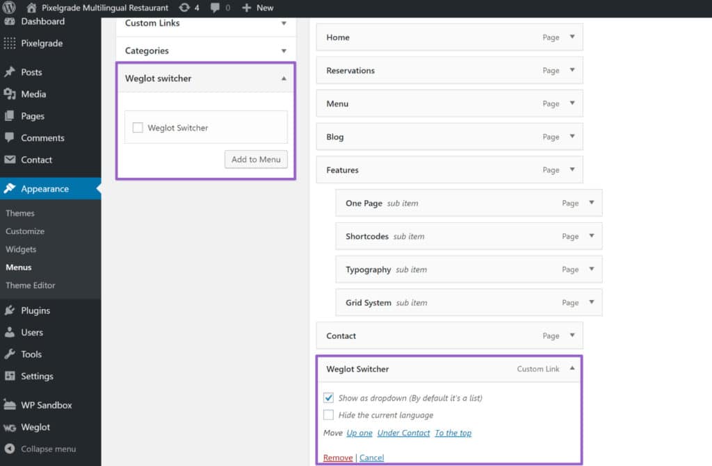 For example, if you wanted to add it as a menu item in the Rosa theme, you could go to Appearance → Menus and add the Weglot switcher menu item: